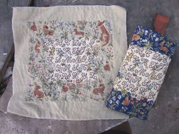 I have bought a bunch of pillow tops at a yard sale in March having no idea what I was going to do with them but for a dollar how could I pass them up. I love the cursive and have a fondness for foxes and rabbits.. I immediately hung the red version on the wall but was still left with a blue and sage green.